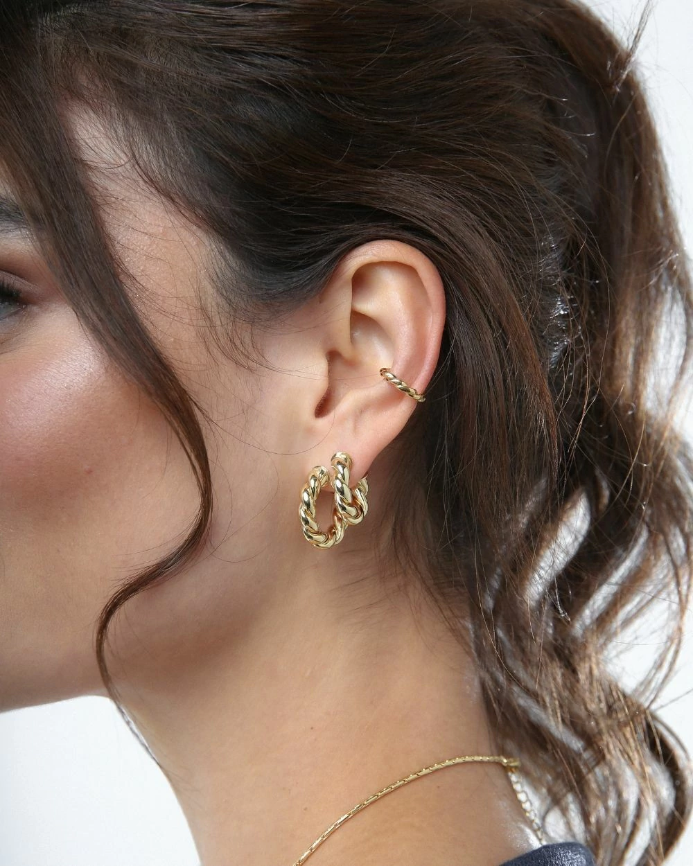 Brinco argola torcida com design liso e fecho tarraxa. Uma argola clássica e moderna, seu design torcido está super em alta e é perfeito para looks do dia a dia! Essa é a nossa versão média (M) e temos também esse modelo no tamanho pequeno (P), que juntas tornam um mix poderoso. Complete o mix com um piercing fake!